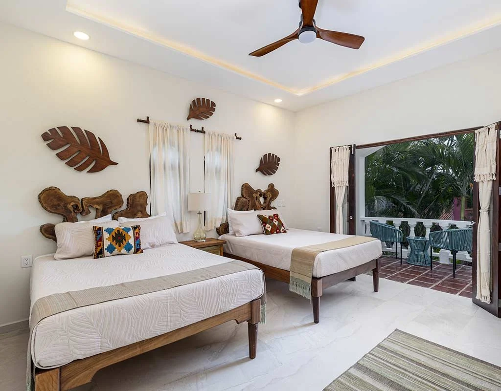 Two Queen beds, en-suite bath, A/C, fans, blackout blinds, and fast Wi-Fi—steps from the saltwater pool, yoga deck, and rooftop.